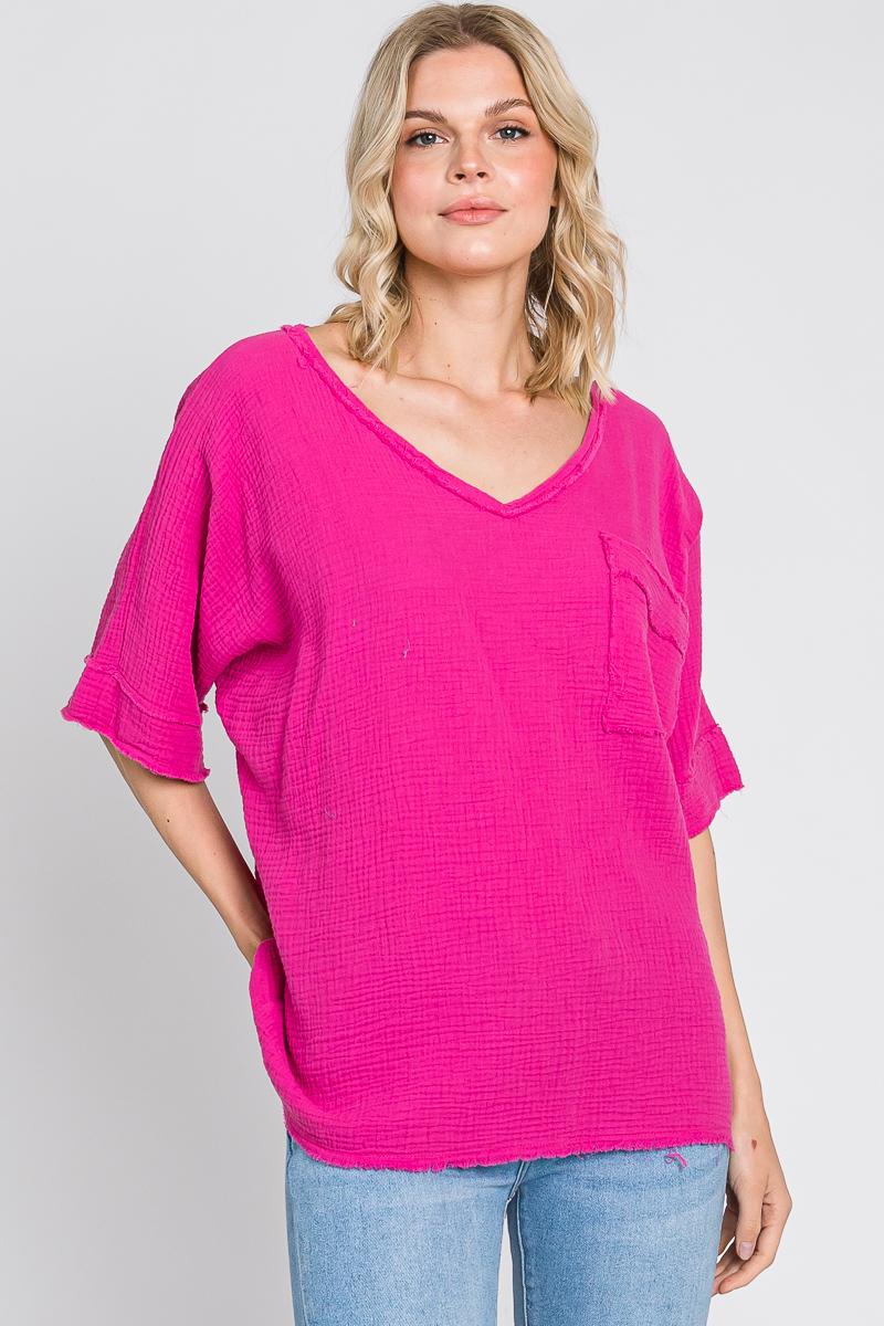 Experience comfort and style with our Ryleigh Double Gauze V-Neck Top. Made from 100% cotton, this garment washed top features a v-neckline, raw edge detail, and a front pocket. The double textured cotton gauze adds a unique touch to this versatile piece. Colors available in: