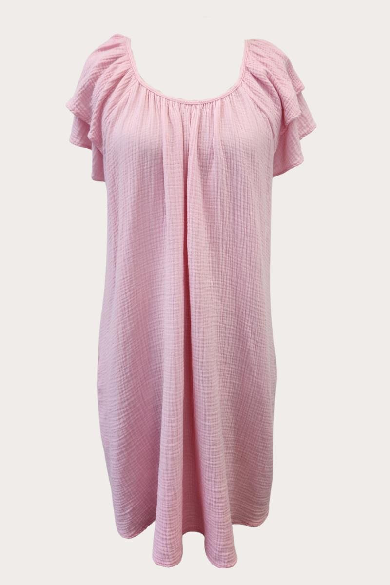 Cute spring dress great for sunny weather! It has double ruffles on the short sleeves and has side pockets! Perfect for a casual, going out day! Our colors: